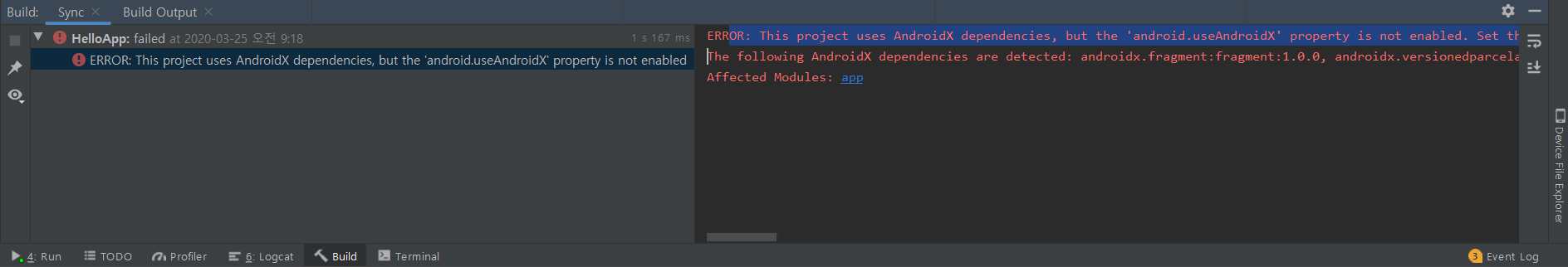 AndroidX를 사용을 하겠다면서 properties에는 그에 대한 표시를 안해주었기 때문에