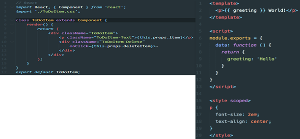 반대로 React는 JavaScript기반으로 개발하여 컴포넌트로 구성하기 쉽고, 재사용성이 높으며 테스트에 용이하다. 또한 React JS의 렌더링 시스템이 더 정밀한 구성이 가능하고, Shallow렌더링[1]과 같은 기능들을 갖고 있다. React에서 data의 불변 속성이 처음에는 복잡해 보일 수 있지만, 복잡한 규모의 앱에서는 테스트와 투명도 측면에서 빛을 발한다.