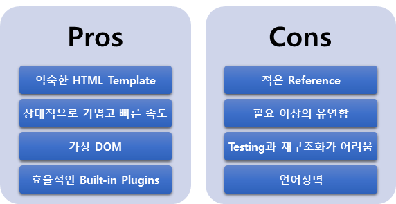 l 자체 Template을 사용하기 때문에, 큰 규모의 어플리케이션 개발에 문제를 겪을 수 있으며, JS와의 직접 연계 측면에서도 불편함을 느낄 수 있다.