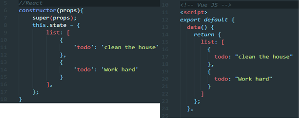 - 초기화한 데이터를 컴포넌트에 전달하는 것은 매우 유사하다. 하지만 두 프레임워크에서 이 데이터를 변경하는 방법은 다르다.