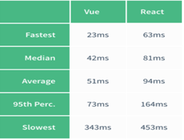 React와 Vue 모두 가상DOM을 만들어 state가 변할 때 실제 DOM과 일치시킨다. Vue의 렌더링 시스템이 React보다 빠르다는 걸 Vue에서 아래와 같이 증명했다.