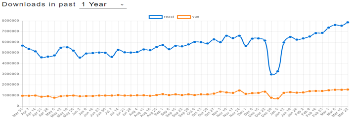 (React JS와 Veu JS의 npm download 추이)